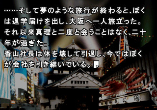 主人公の透と恋人の真理は、スキーロッジでの休暇中に、恐ろしい殺人事件に巻き込まれてしまう。ゲームの前半は、犯罪解決のアドベンチャーとして展開される。プレイヤーが手がかりを見つけられないと、さらなる殺人が発生し、物語はホラー映画のような結末を迎える。