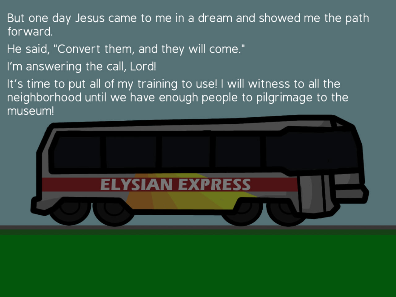 ミゲルは新しい創造論博物館について学ぶことに興奮しているが、地元のバス路線は需要がないためそこまで運行していないことを知り落胆する。彼は隣人を改宗させ、一緒に博物館へ巡礼できるようにすることを決意する。