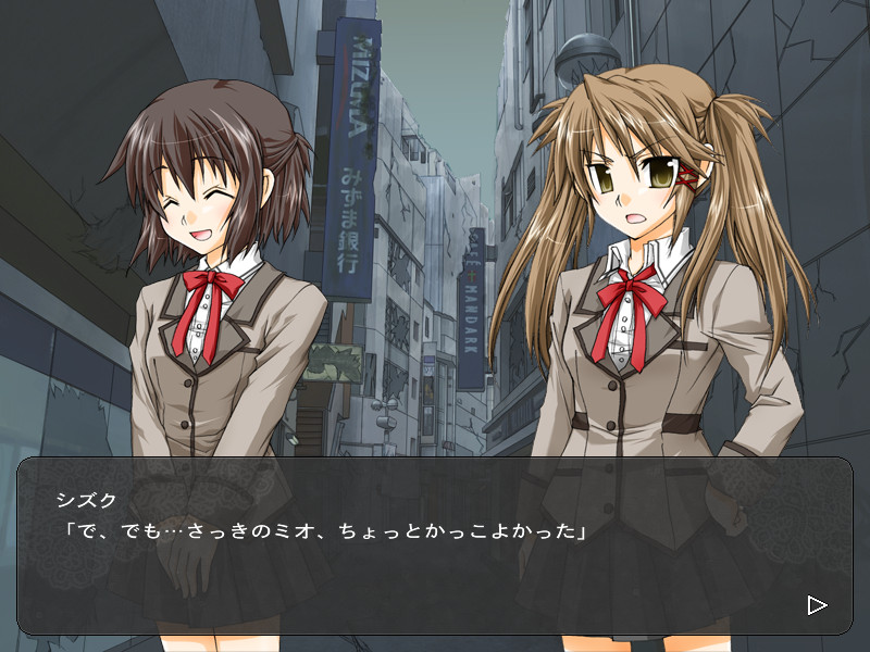 様々な地区に分かれた世界を舞台に、物語はミオと幼なじみのシズクが学校へ行くところから始まります。学校で彼女たちは友人であるユキと、最近起こったいくつかの「吸血鬼」殺人事件と白い服の少女に関する噂について話します。