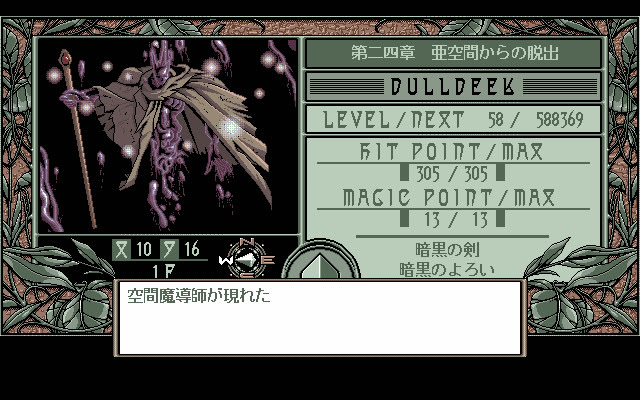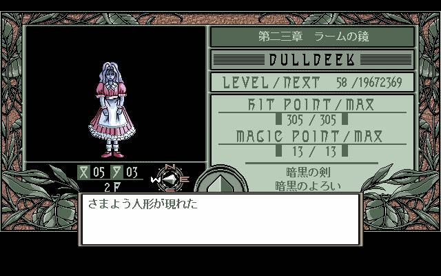 『D'ark』は非常にシンプルなソロのファーストパーソン・ダンジョンクロールです。ドルディークとして、プレイヤーは迷路のような擬似3Dダンジョン(自動マッピング付き)をナビゲートし、ランダムに出現する敵と遭遇し、ターン制の戦闘で戦って経験値を獲得し、レベルアップします。魔法システムは非常に基本的で、「攻撃魔法」または「回復魔法」のいずれかを選択でき、どちらも魔法ポイントを消費します。やや珍しい機能は、いつでもランダムエンカウントを完全にオフにできるオプションです。