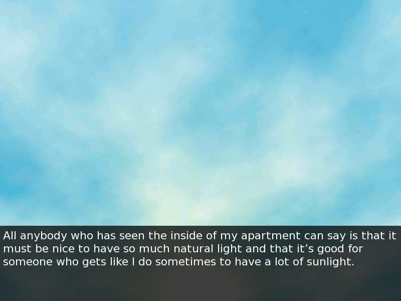 「My Heart Becomes Ice Cream」は、非常に短いキネティックノベル(おそらく2分程度の長さ)で、「私はアストリアに大きな窓のあるアパートを持っている」という書き出しで始まります。