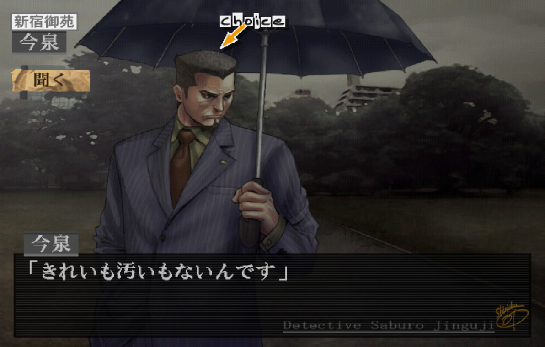 ゲームが始まると、神宮寺の有能な助手である御苑洋子が事務所を去ったことがわかる。神宮寺のようなタフな男でも、その痛手を感じ、かつての部下を恋しく思っている。しかし、神宮寺は痛みをこらえながら、事件と探偵の仕事に邁進する。「KIND OF BLUE」の新しいシナリオでは、凄腕探偵が犯罪組織との対決や、地元のジャズバーから失踪した歌手の捜索に乗り出す。いつものように、太った熊野参三警部がゲーム中、サポートとアドバイスを提供する。