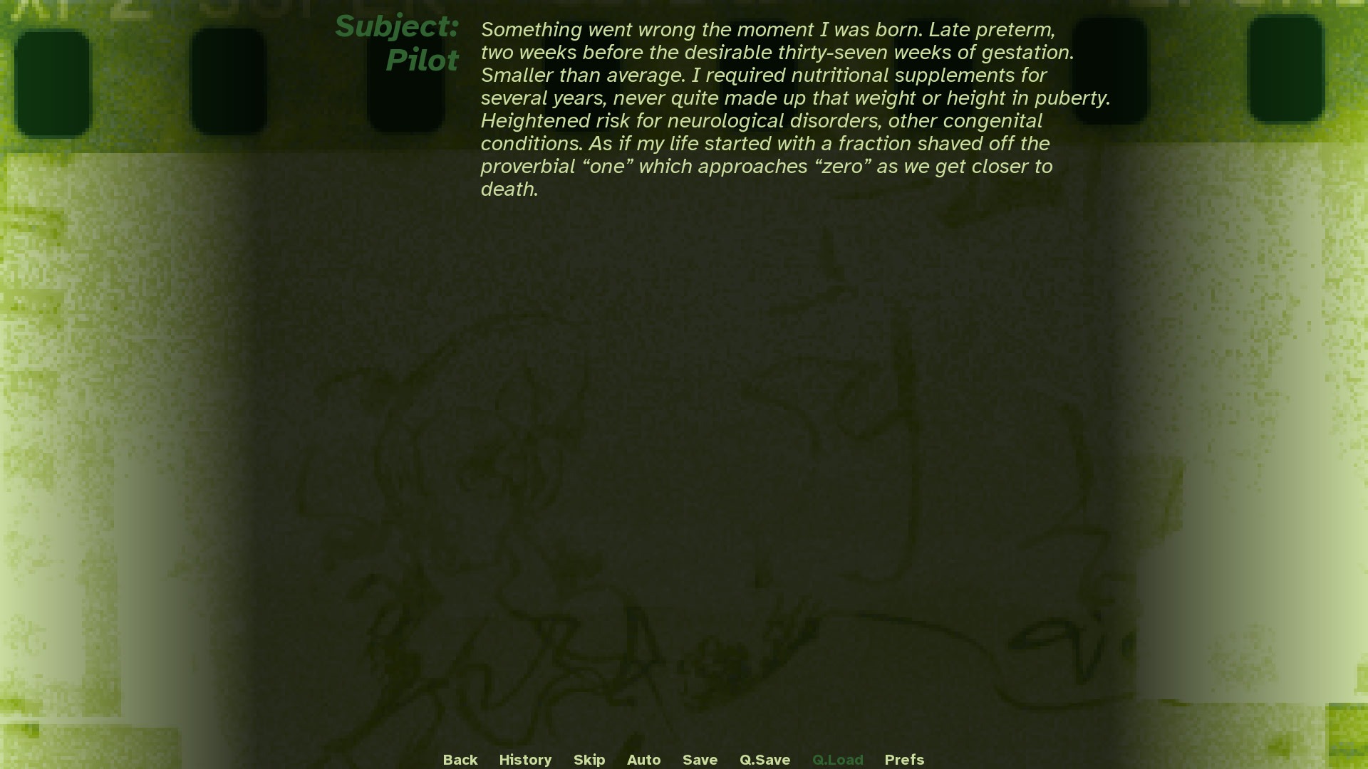 実験を通して人間以上の存在になることについての、一口サイズの静的なビジュアルノベル。自己嫌悪と変身。その生地で身を飾ってください。