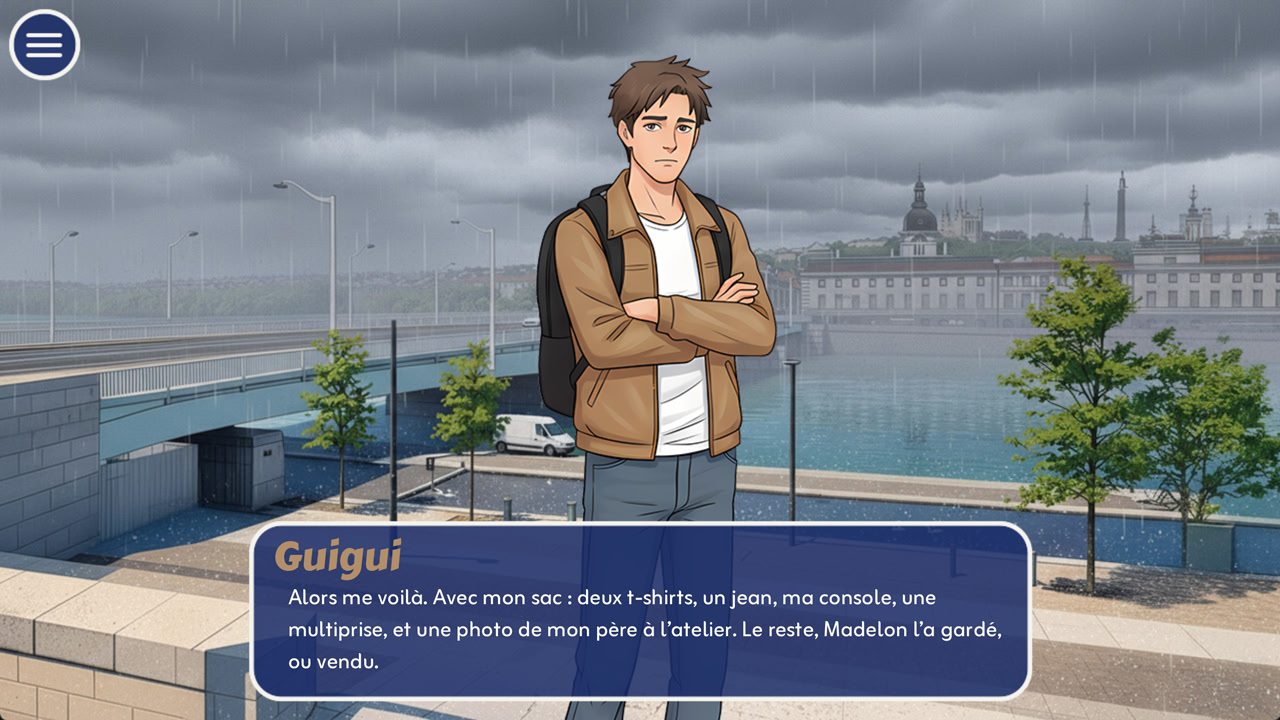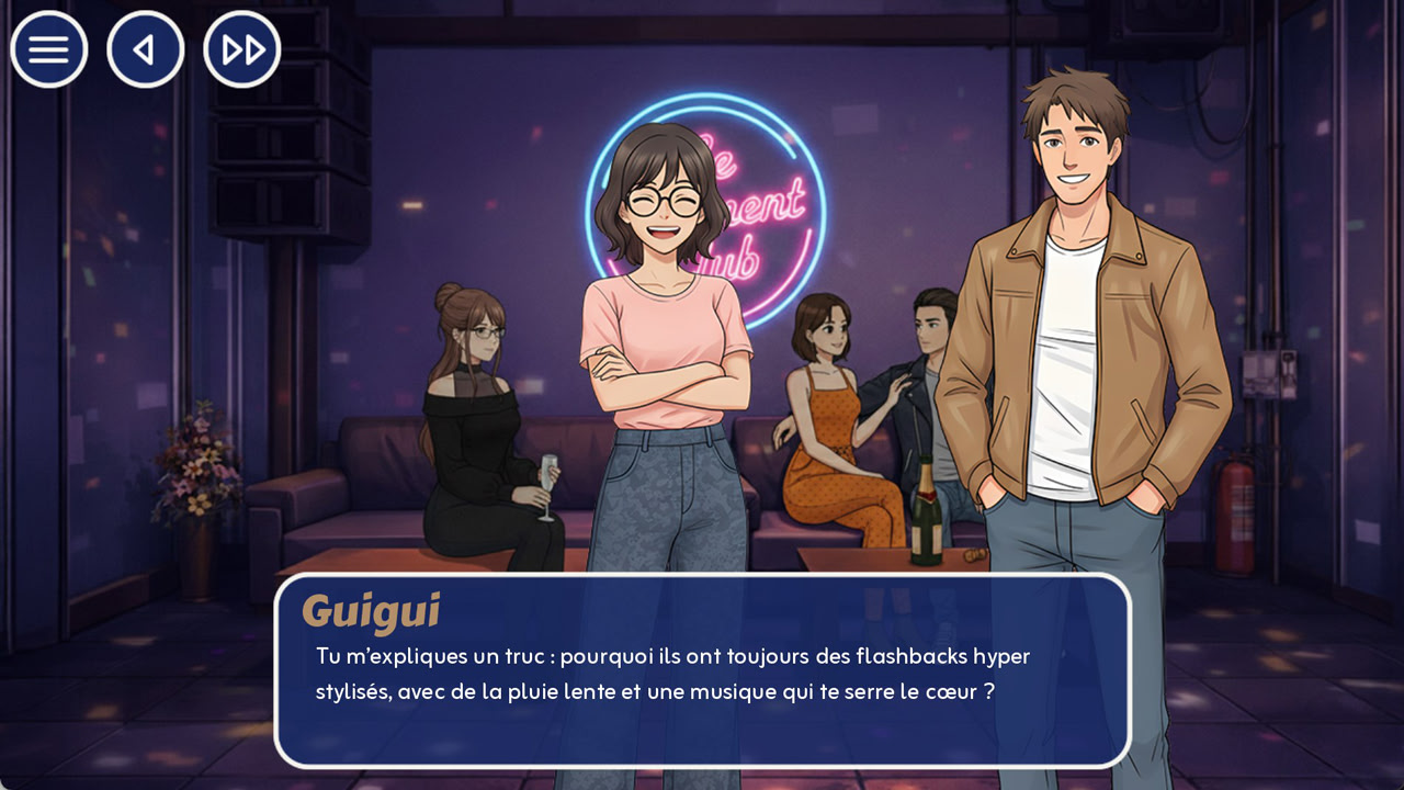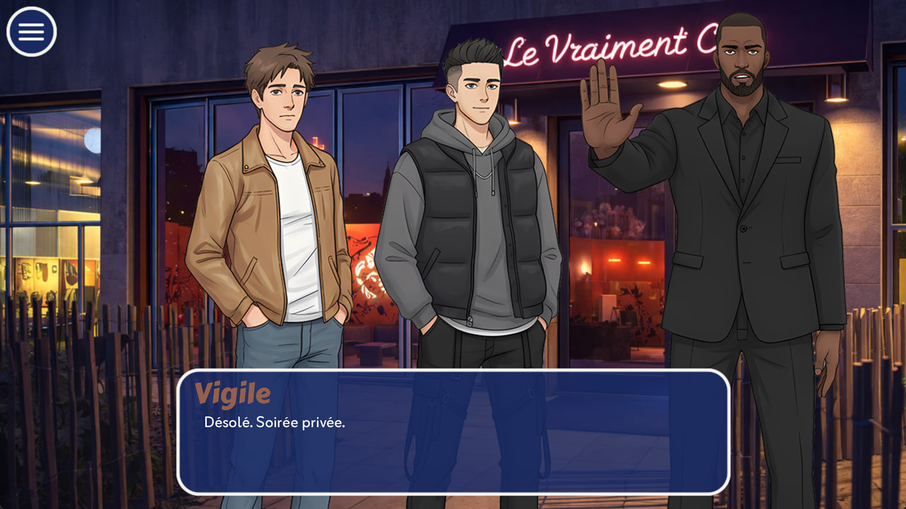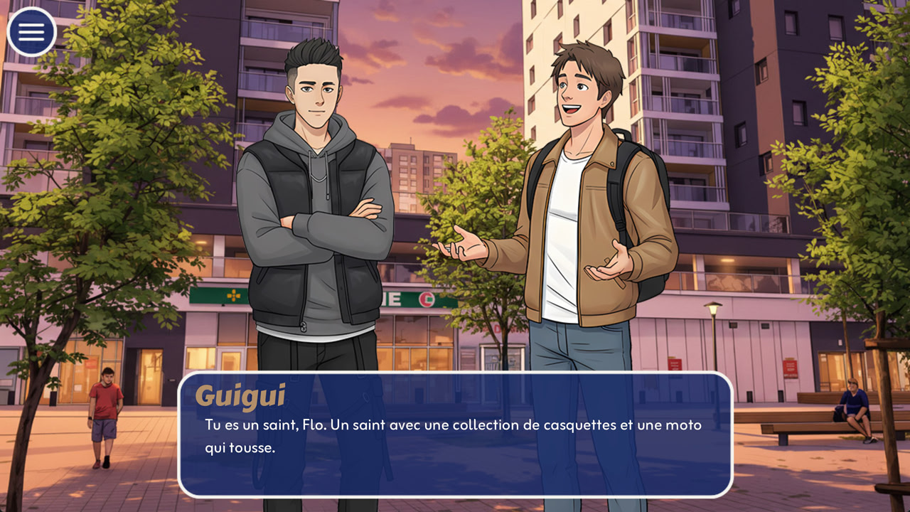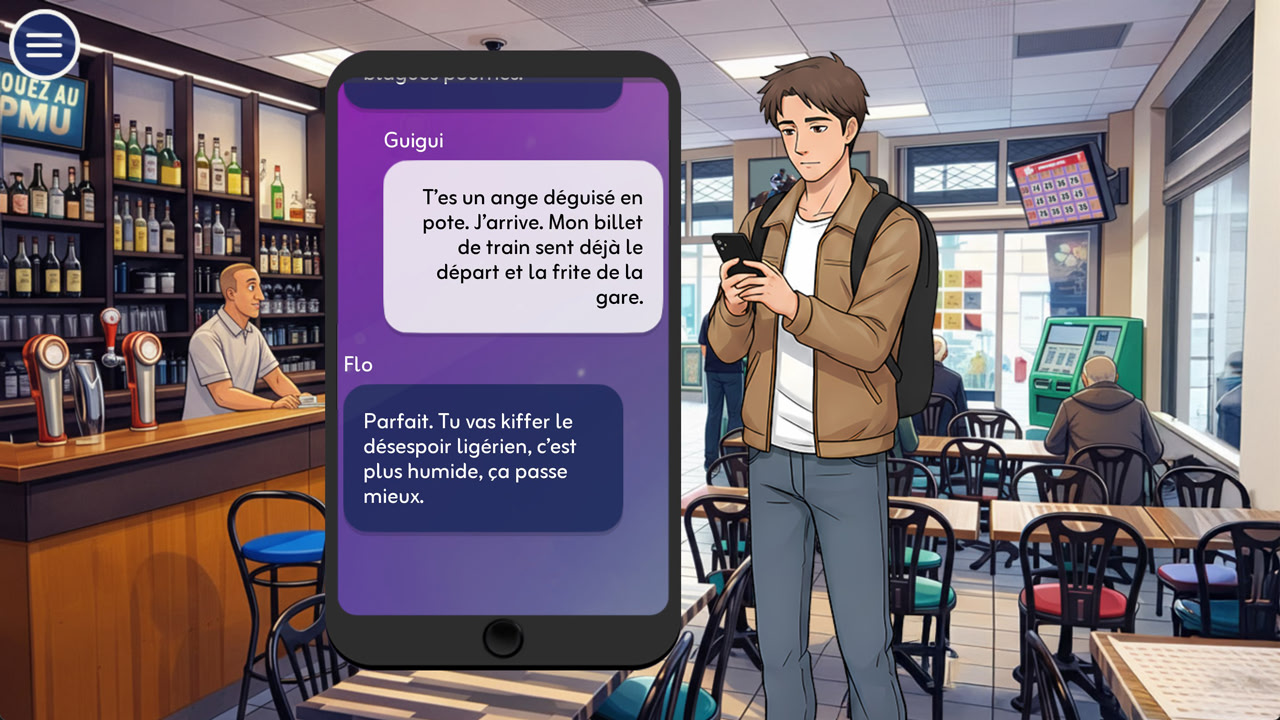 Datin' Nantesはユーモラスな恋愛ビジュアルノベルです。主人公のギギは、リヨンでのひどい失恋と暗号通貨の暴落の後、「remontada express(電撃的な復活)」のためにナントに引っ越します。ゲームプレイは、新しいソウルメイトを見つけるために、プランA(ナイトクラブに行く)またはプランB(出会い系アプリを使う)のどちらかを選択することを中心に展開します。あなたは分岐する会話オプションを通じて様々なキャラクターと交流し、SMSのやり取りと対面でのデートの両方を管理します。親密度が高いと、ゲームの焦点が完全にあなたの親密なつながりに移行する特別なカットシーンがアンロックされます。ただし、誤った判断はユニークなゲームオーバーを引き起こす可能性があります。